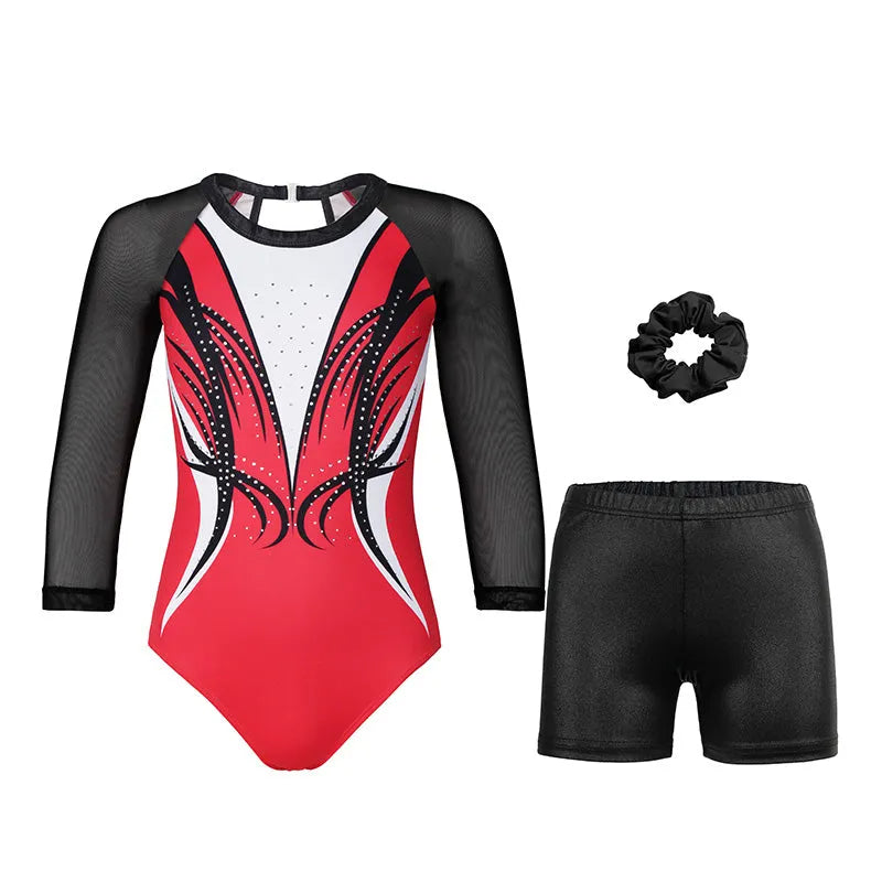 Red-black Diamond 3/4 Mesh Sleeve Gymnastics Leotard Set for Girls